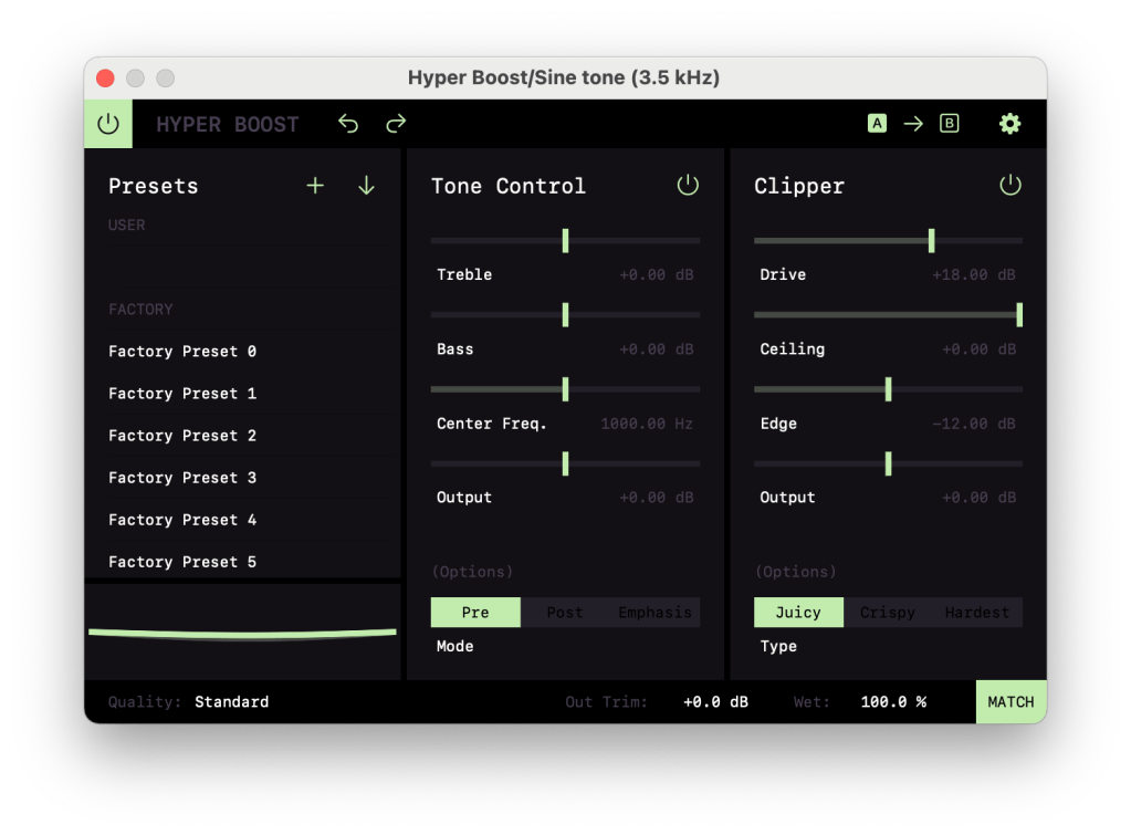 For reference here are the Hyper Boost settings as well as the clean signal. This test should be easy to set up in your own DAW!