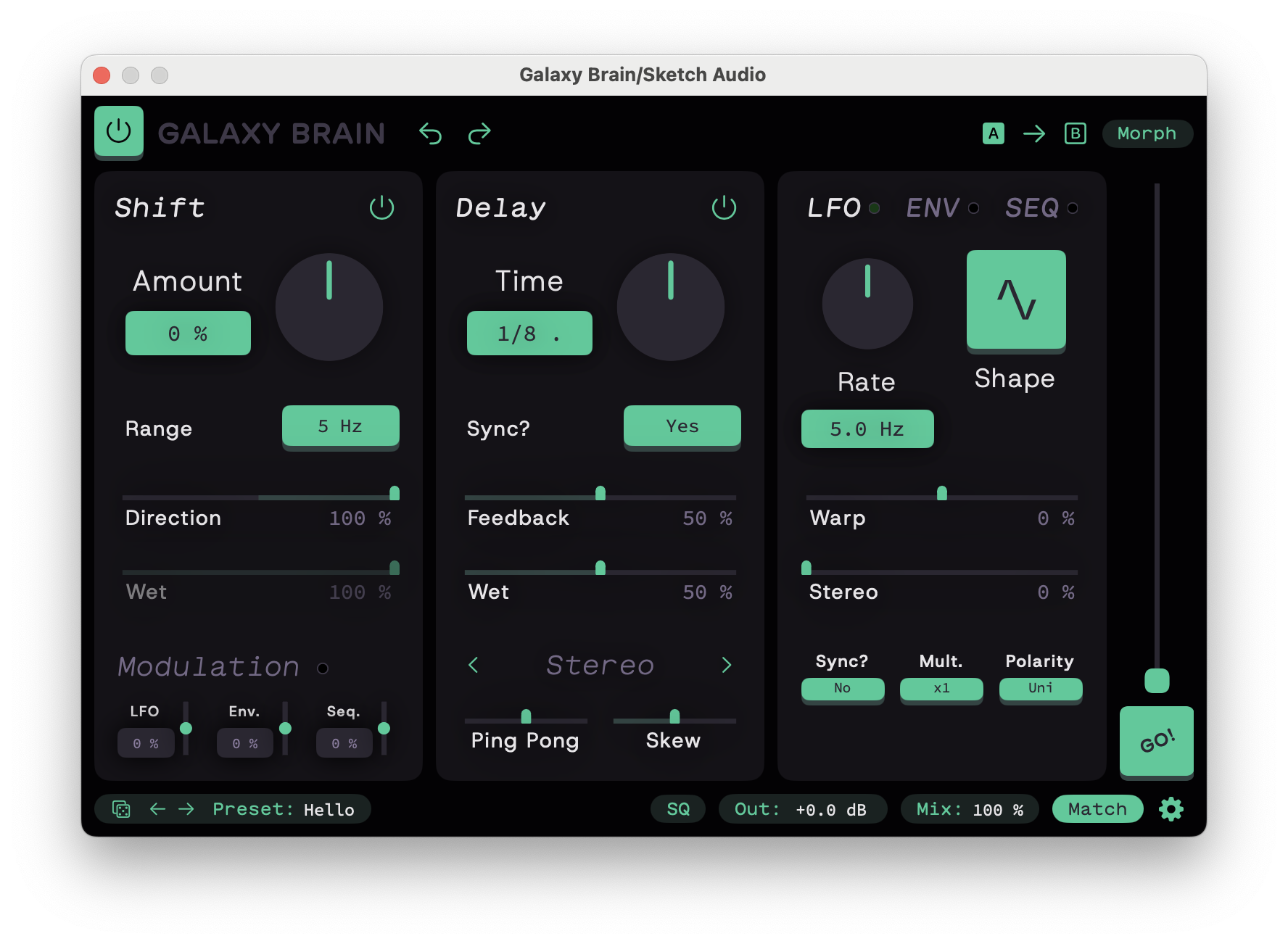 Galaxy Brain is a frequency shifter + delay combo ready to take any sound into outer space. With easy stereo controls, three modulation sources (LFO, Envelope, & Sequence) and optional hardware clipping, things can go intergalactic very quickly!